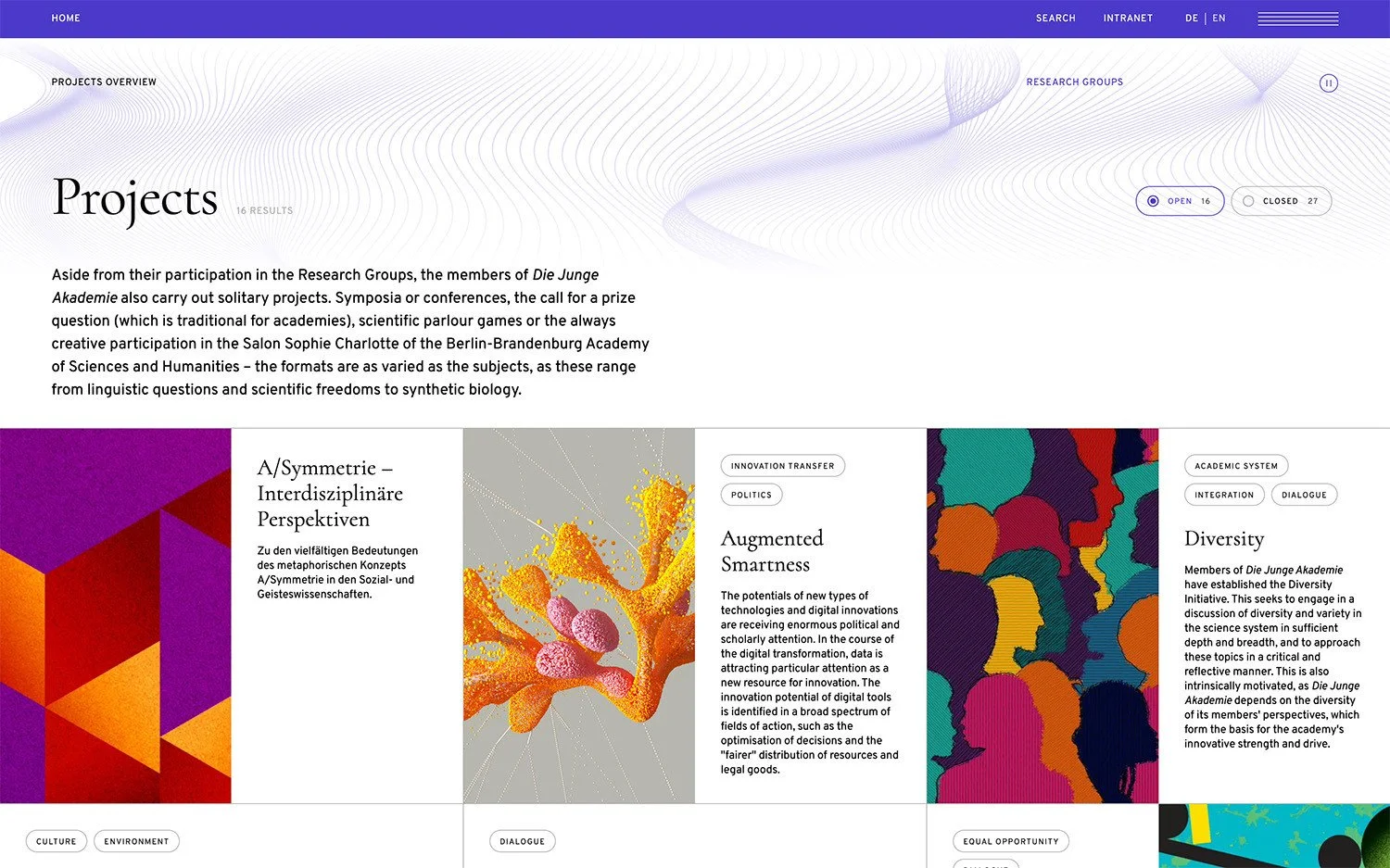 Das CI der Jungen Akademie besteht im Wesentlichen aus 4 Farben, 2 Schriften und einem linearen grafischen Keyvisual. Um diese Komponenten digital zum Leben zu erwecken, haben wir die Farben angepasst und eine Animation des Keyvisuals erstellt, die aus Gründen der Barrierefreiheit pausiert werden kann. Da die Farben nie zusammen verwendet werden und auch nicht mit bestimmten Themen in Verbindung gebracht werden sollten, entschieden wir uns, sie auch auf der Website zu trennen. Jedes Mal, wenn Sie die Website besuchen, ändert sich die Farbe der Hervorhebung auf der gesamten Website nach dem Zufallsprinzip. Um die Farbe manuell zu ändern, können Sie auf die Menüleiste doppelklicken und die Farbe wird sich ändern. Die Kernelemente aus inhaltlicher und gestalterischer Sicht sind die Projekte und Arbeitsgruppen, die auch die verschiedenen Themen repräsentieren, an denen die Stipendiaten arbeiten und damit das, wofür Die Junge Akademie steht, aber auch die Stipendiaten selbst und natürlich alles, was sie in die Welt hinaus tragen, was durch den Feed „Alle Aktivitäten“ repräsentiert wird. Wir haben uns für zwei Versionen des Feeds entschieden, eine unregelmäßige, die mehr zum Stöbern einlädt, und eine regelmäßige, die leichter nach bestimmten Übersichten (nur Publikationen etc.) zu durchsuchen ist.